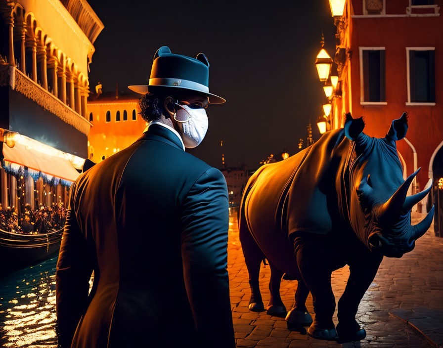 Prompt: a masked man in a tuxedo, a black cat, a rhino, in a gondola, night, Venice, carnival. oil painting, Caravaggio, cinematic, wide-angle, neo-noir, film-noir, John Singer Sargent, long shadows,