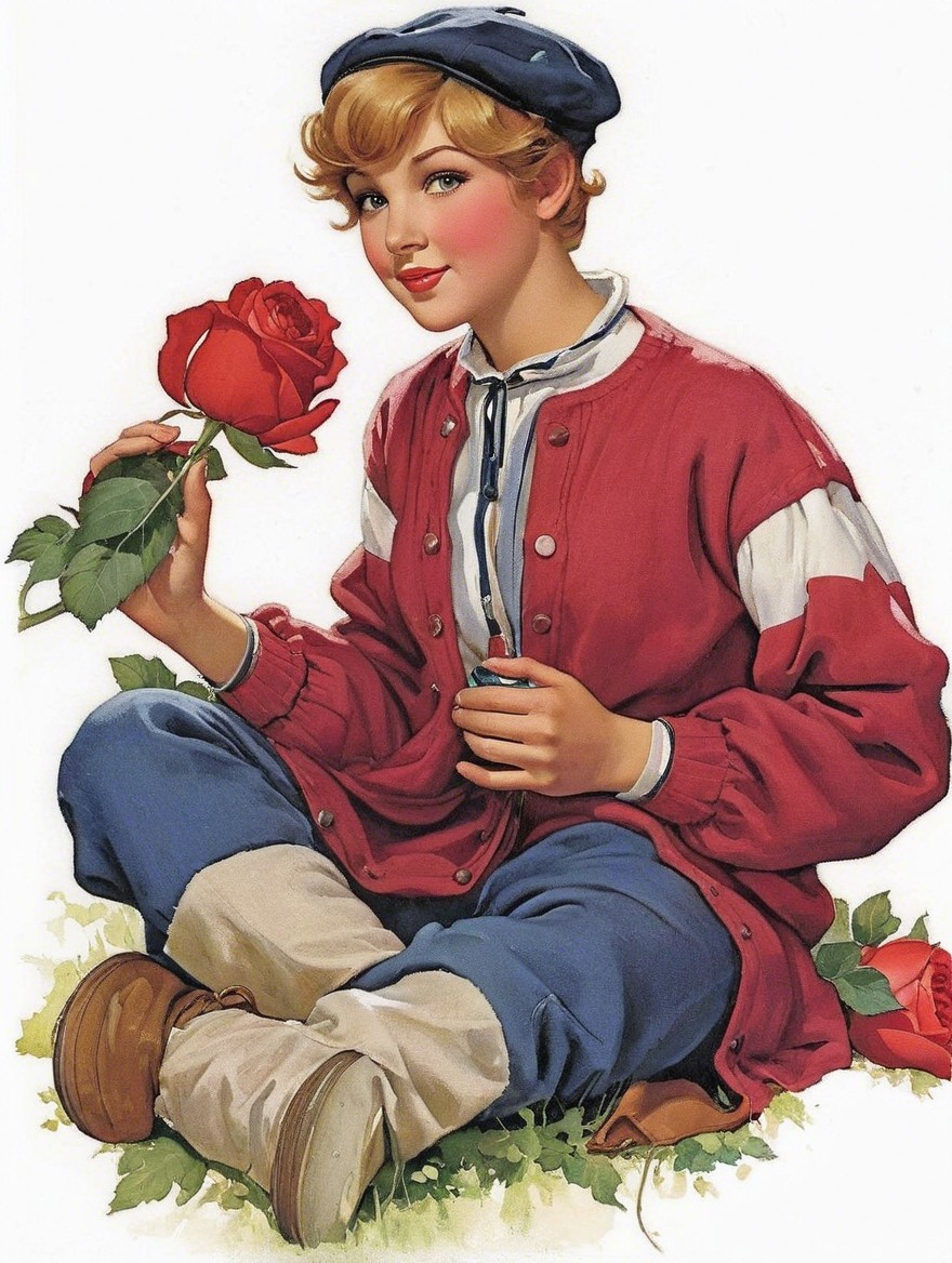 A cheerful young boy with blond hair and a navy cap sits among roses. He is wearing a red varsity jacket and blue jeans and playsfully points at a red rose while smiling.