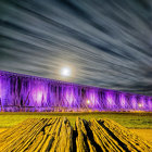 A serene scene featuring a traditional wooden temple illuminated by golden light under a bright full moon. Wispy clouds and a starry sky enhance the tranquil atmosphere, surrounded by vibrant fields.