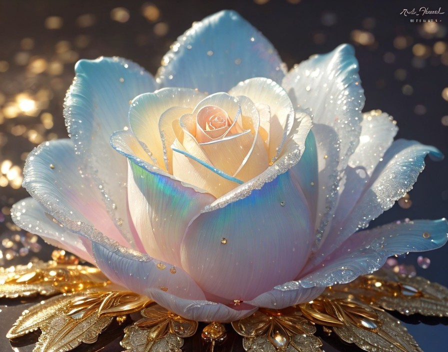 Prompt: Depict an image of a wet rose Flower Using gowing Fiber Optic with gold edges on petalsand dew drops in natural state, Beautiful iridescent glass flowers in the style of Rene Lalique with sparkles, Made of glass Gilded petal edges and stems ,shiny golden in the sunlight, beautiful, soft, Victorian style background with flowers and lace , silver and intricate golden details colour glow, UHD, dark fantasy, Elden Ring, Dark souls, Cinematic, Color Grading, portrait Photography, Ultra-Wide Angle, Shot on 70mm lens, Depth of Field, DOF, Tilt Blur, Shutter Speed 1/1000, F/22, Bokeh