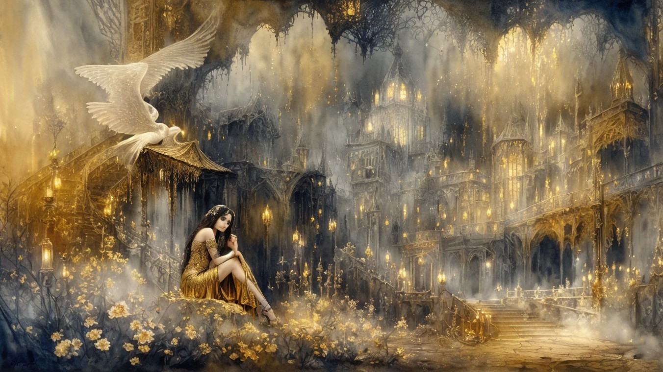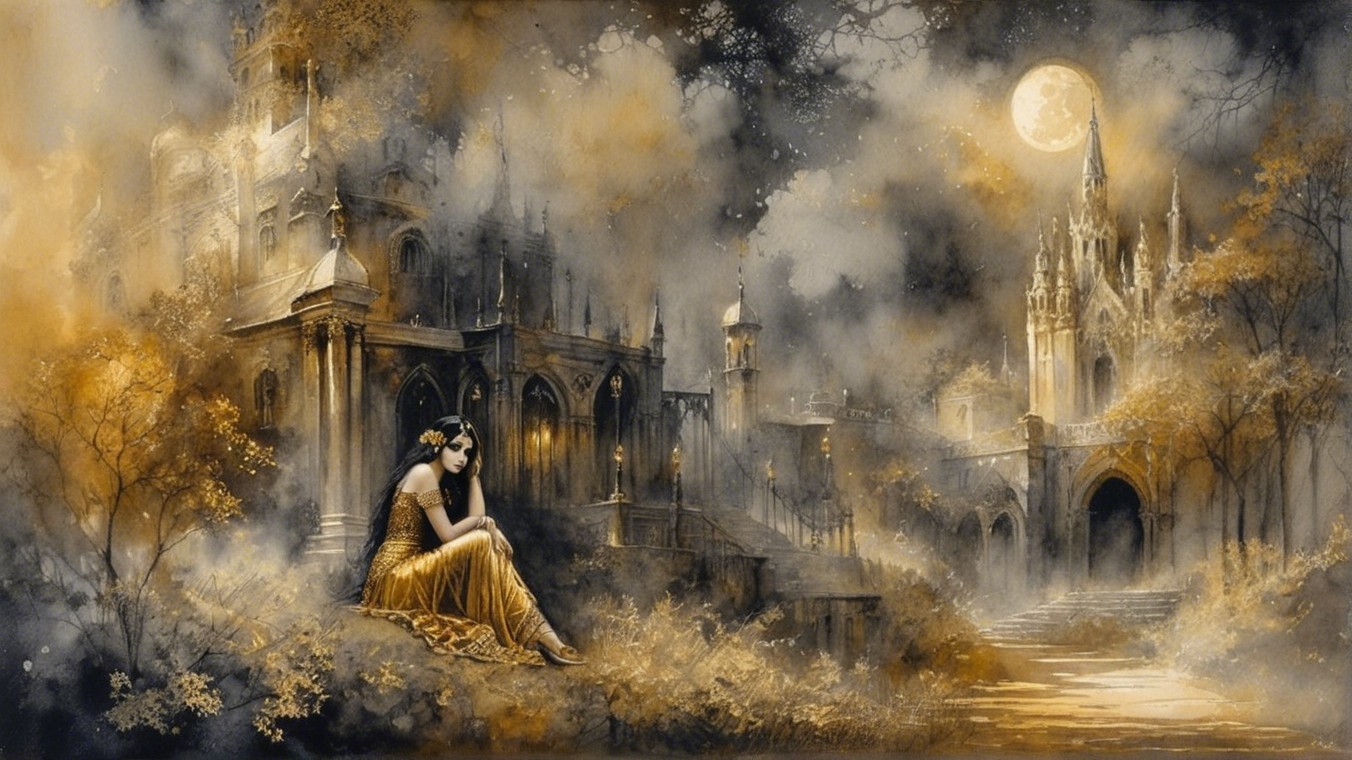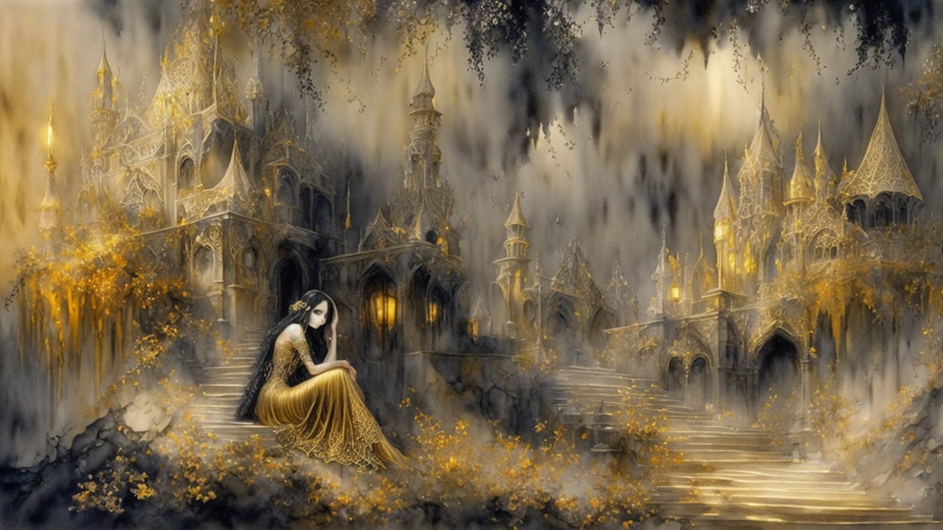 A mysterious woman with long black hair and golden attire lounges elegantly amidst softly glowing candles and ornate architecture, evoking an enchanting and ethereal atmosphere.