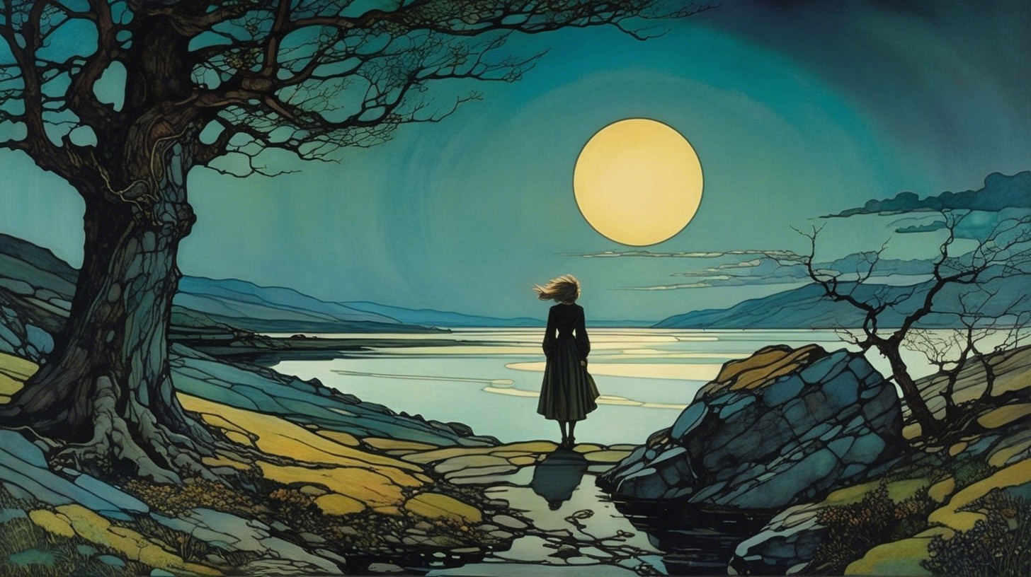 A serene landscape features a silhouetted figure standing by a tranquil body of water, illuminated by a large, radiant moon. The scene is framed by a gnarled tree and distant mountains.