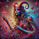 A colorful, fantastical portrait of a woman with vibrant, flowing hair adorned with decorative horns. Her makeup is striking, featuring rich hues and intricate patterns, blending art and fantasy.