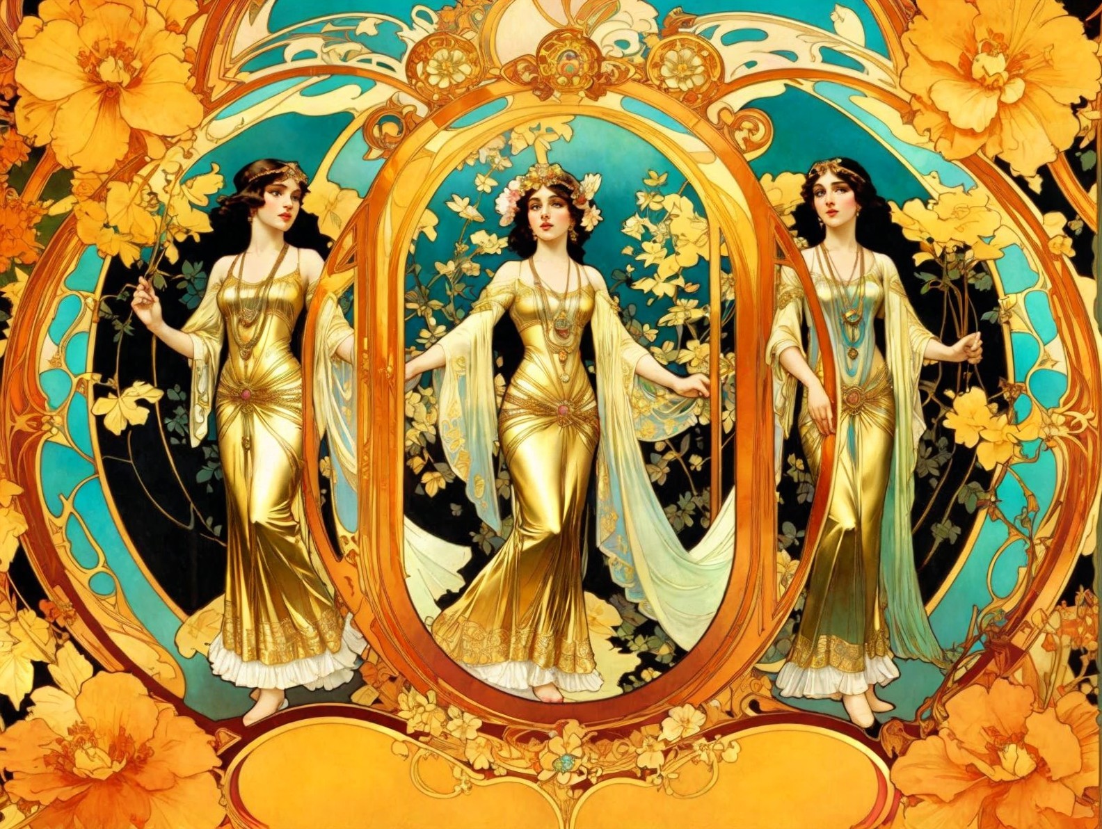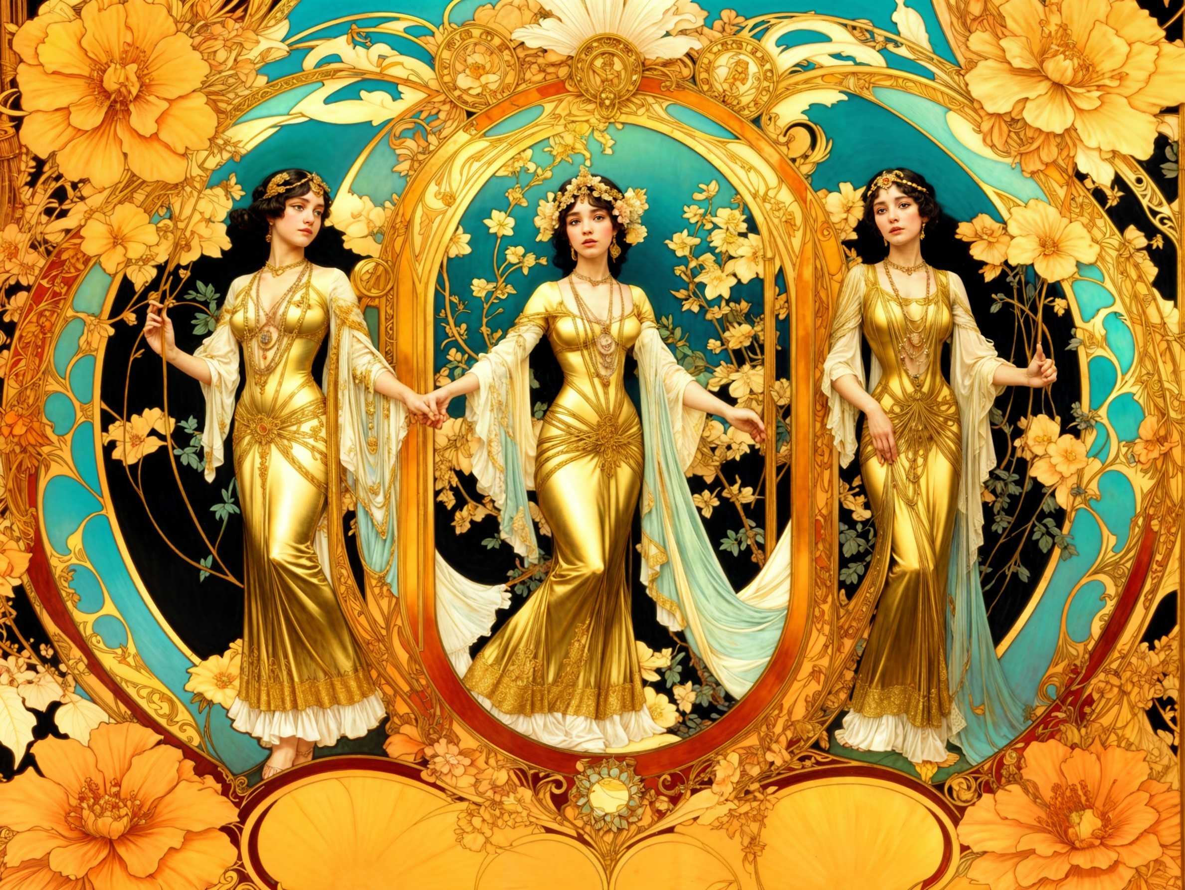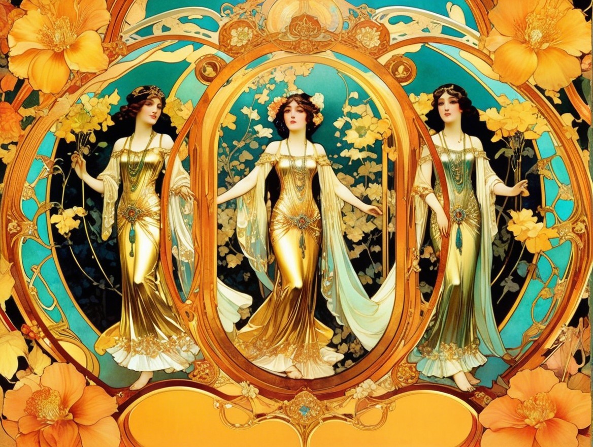The image features three elegant figures dressed in golden gowns, framed by intricate floral patterns and vibrant colors, evoking a sense of beauty and grandeur reminiscent of Art Nouveau style.