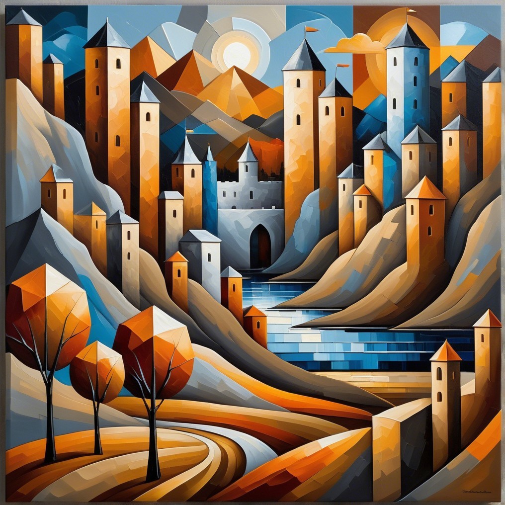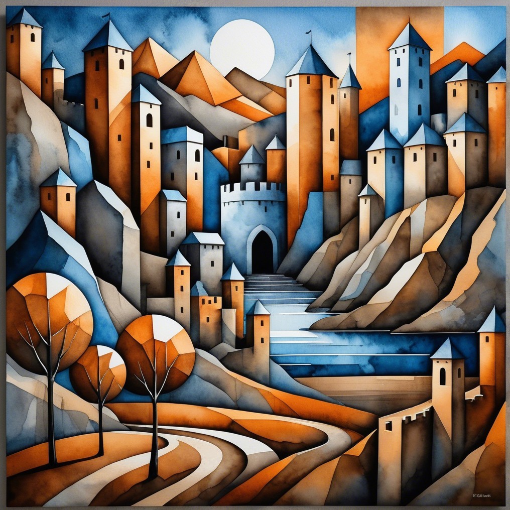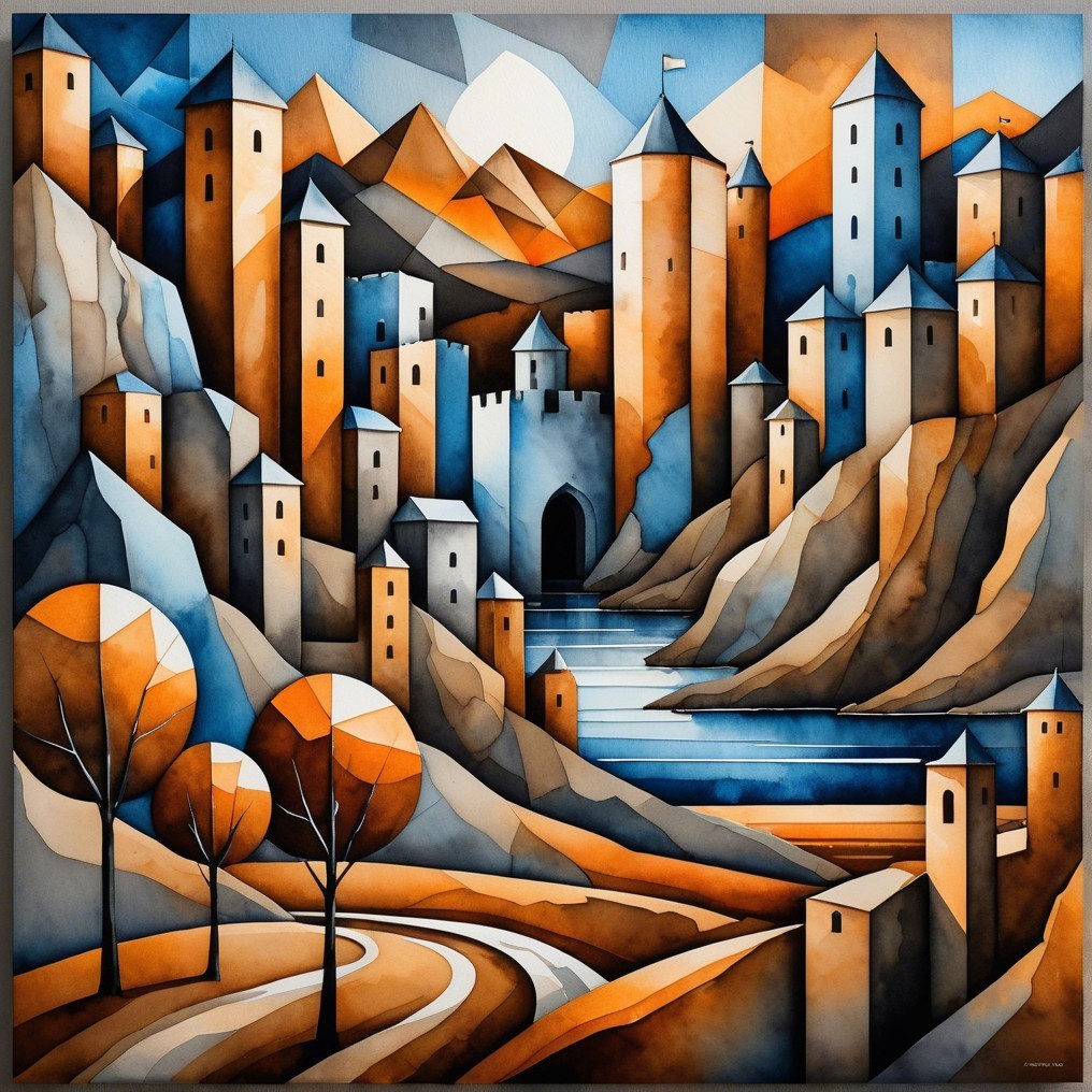 A majestic castle sits atop rocky cliffs, surrounded by mountains and a serene river. Vibrant autumn trees add warmth to the watercolor scene, with a soft sunset enhancing the magical atmosphere.