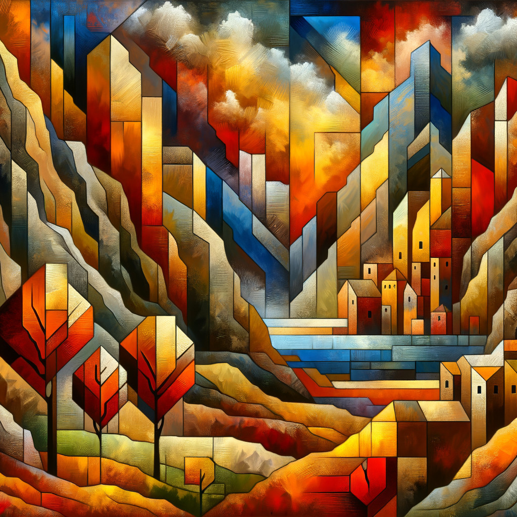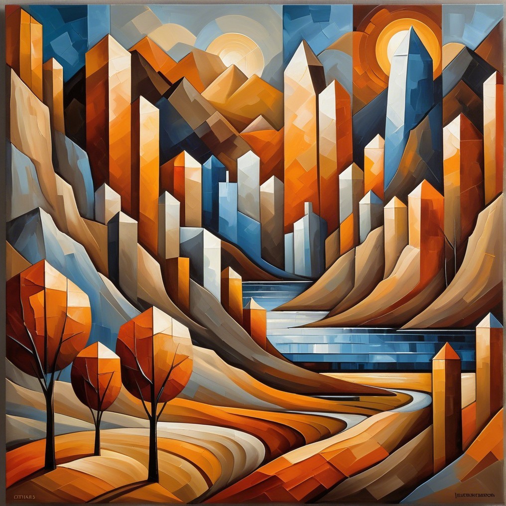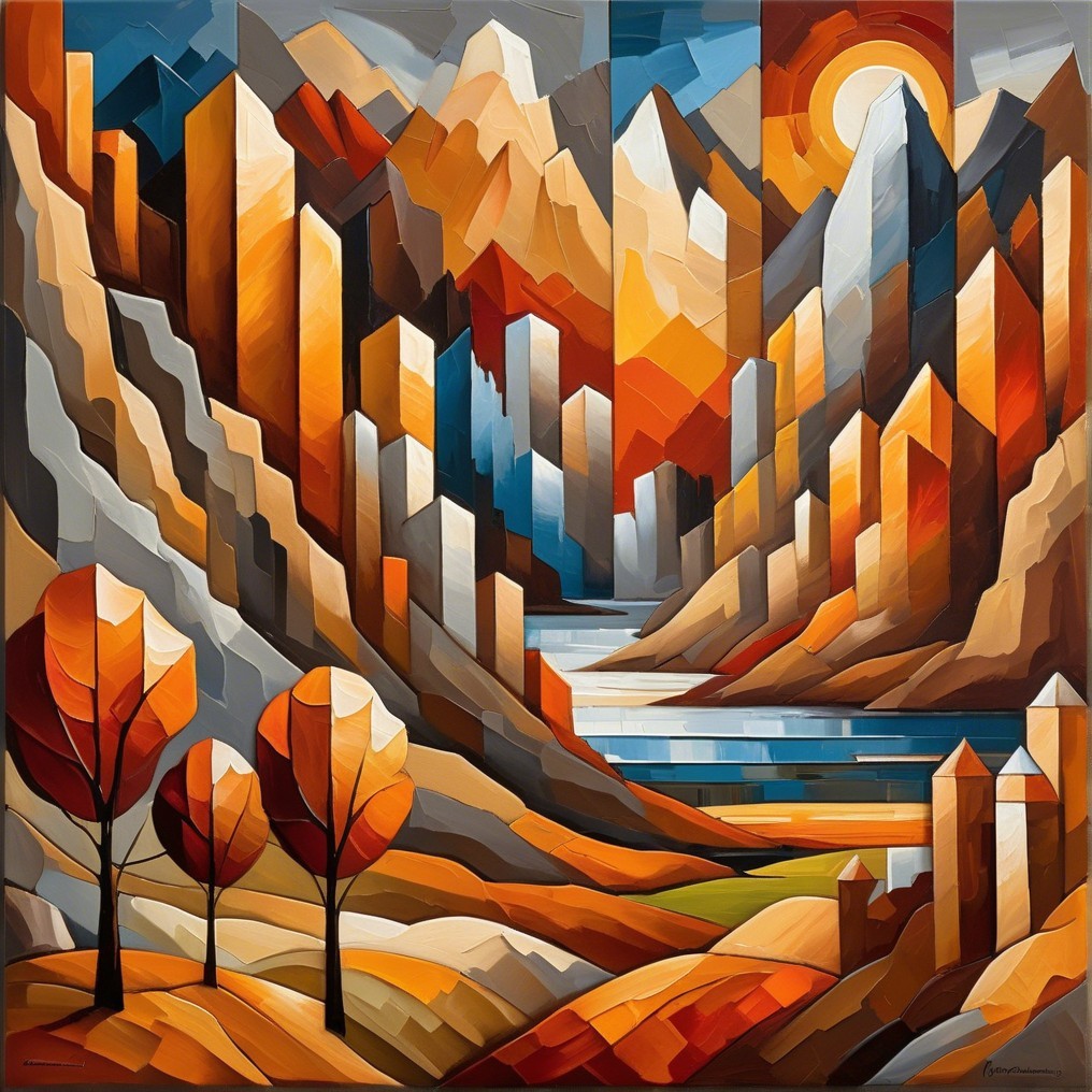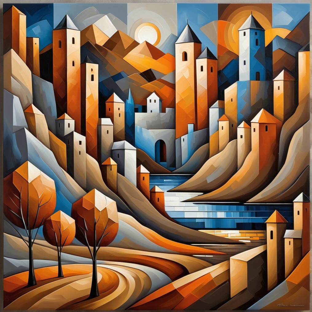 A majestic castle sits atop rocky cliffs, surrounded by mountains and a serene river. Vibrant autumn trees add warmth to the watercolor scene, with a soft sunset enhancing the magical atmosphere.