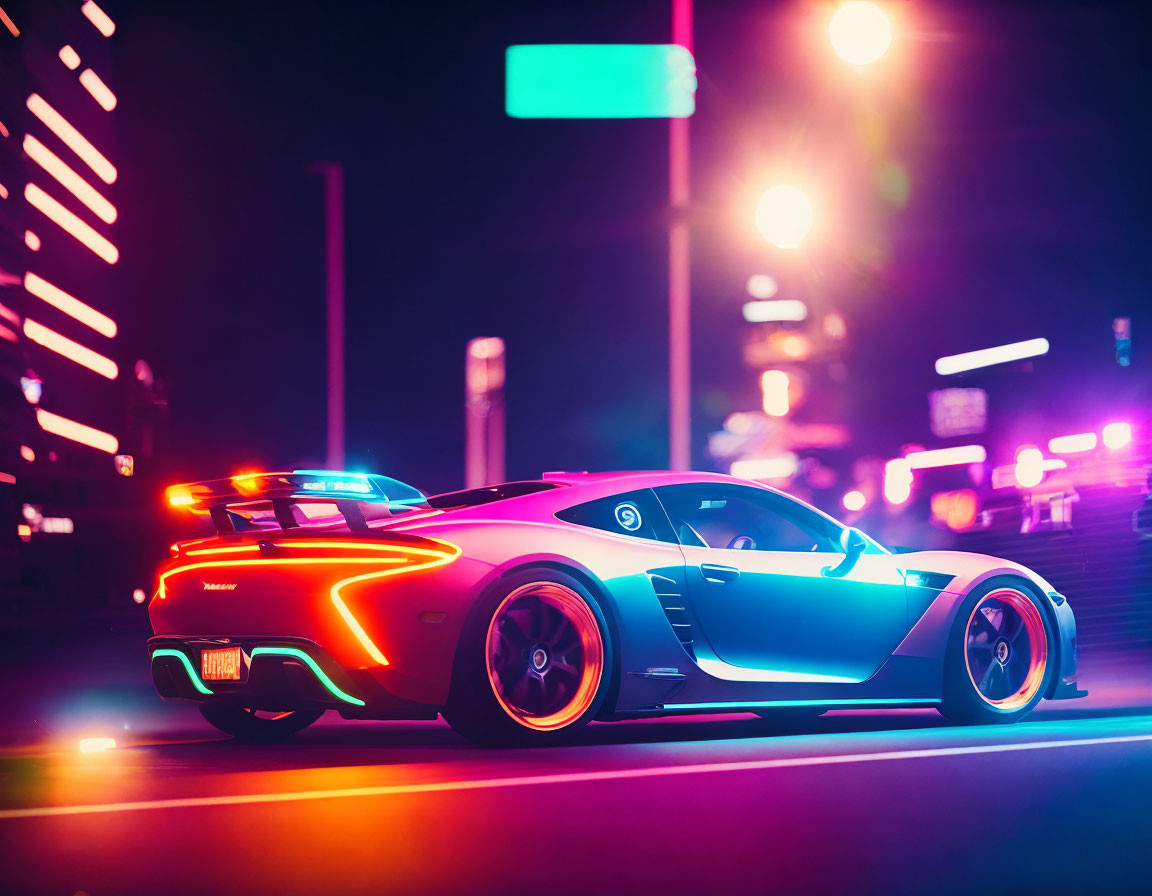 Prompt: A high-performance sports car speeding through the city streets at night, with sleek and aggressive lines. The car is surrounded by a pulsating bass wave, representing the power of the music. The cityscape is illuminated by neon lights, casting vibrant reflections on the car's polished surface.
