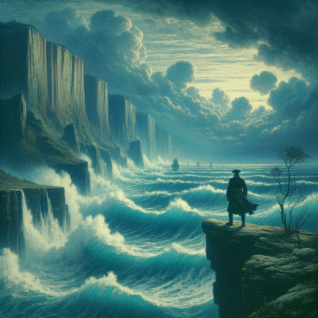 The tempestuous ocean and the brooding sky merging into a powerful expression of nature's untamed beauty. The sailor, a small yet significant presence in the vastness of the landscape, is depicted with resilience, facing the unyielding force of nature with a quiet, stoic determination."