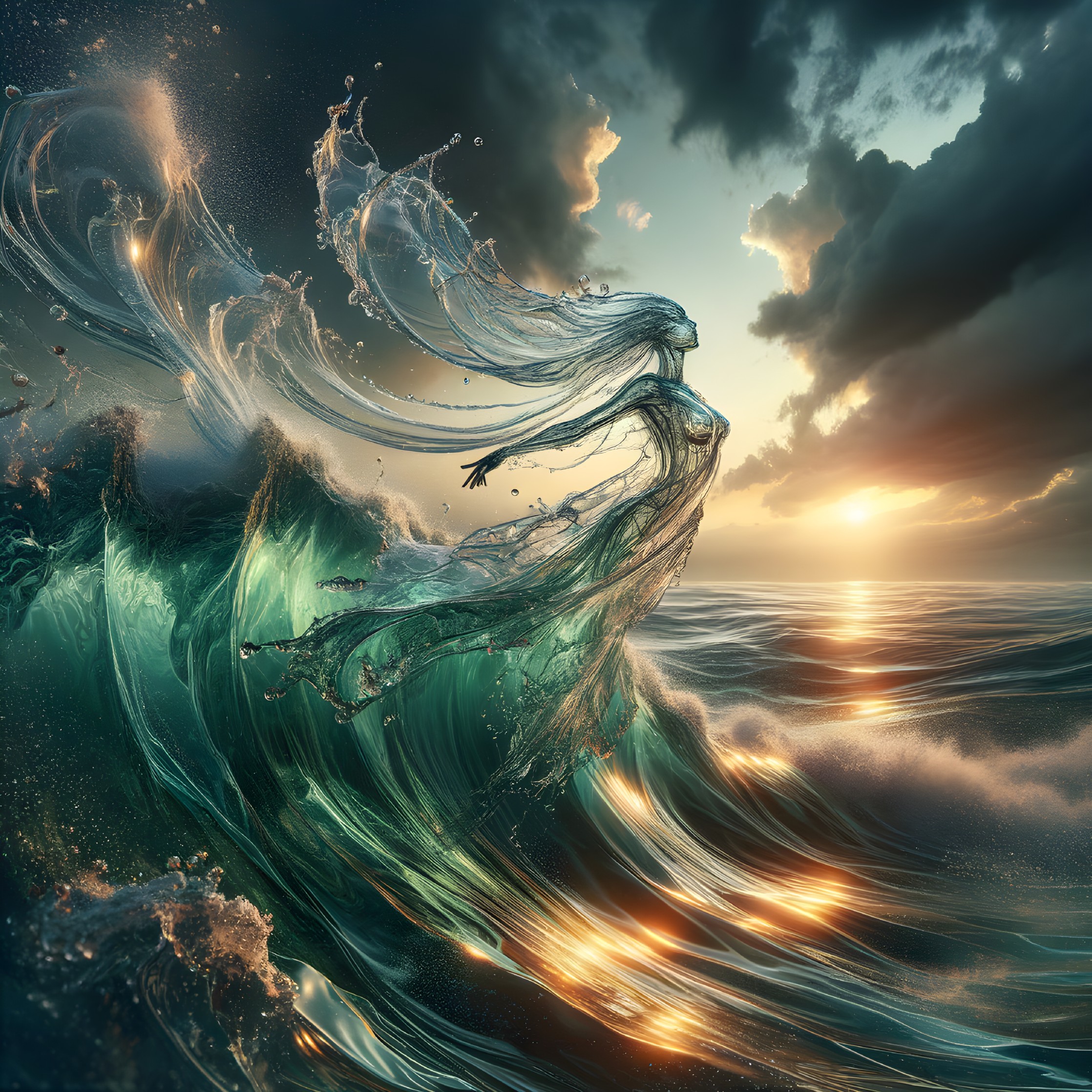 Capture an award-winning hyperrealistic photograph of a transparent wave resembling a dancing woman in a stormy ocean. Utilize cinematic lighting, detailed textures, and vibrant colors to evoke a mesmerizing and dynamic scene.
