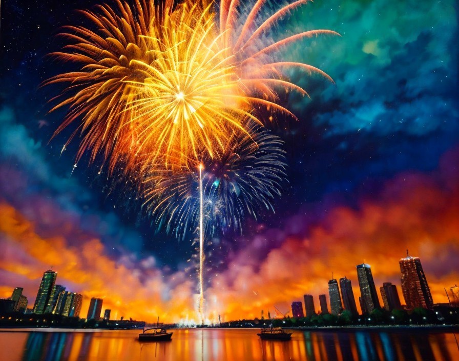 Wide river. Highrise on the riversides. Fireworks in the sky.
