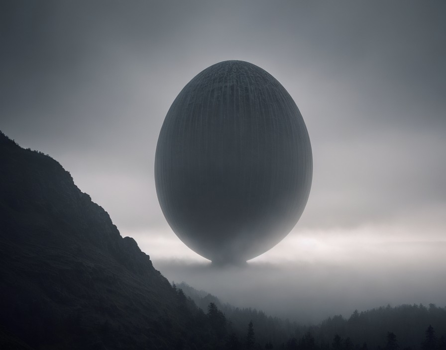Prompt: A giant Egg, photography in the style of detailed hyperrealism, stylish, dark, full-body photography, valley, foggy, shrouded in fog, mountains, soft light, futurism, Louise Bourgeois, Anish Kapoor, expressive, hyper detailed, intricate, artstation, dof, original phenomenal masterwork with virtuoso details