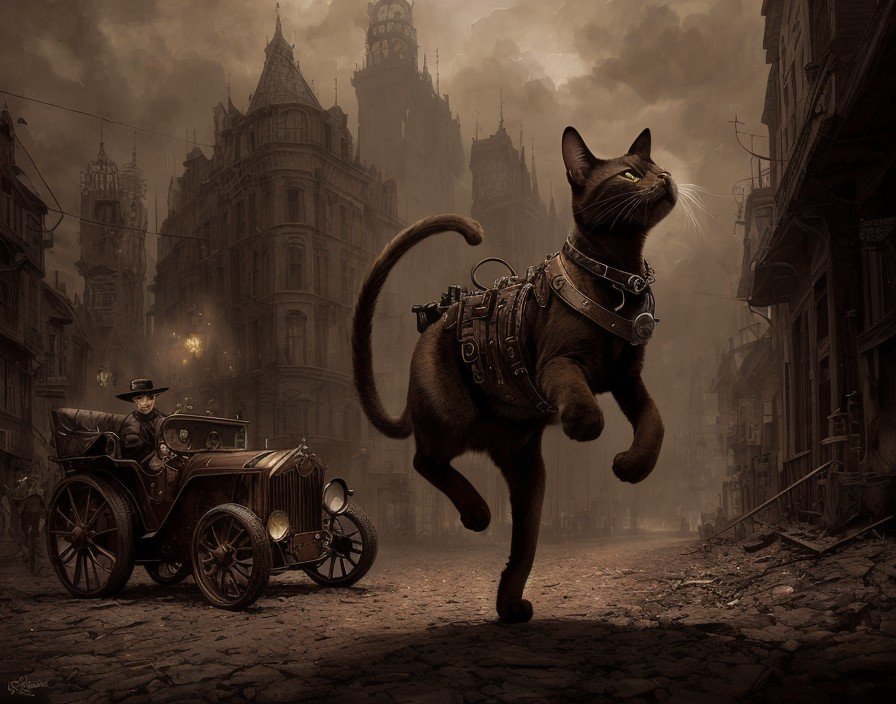 A giant cat with a harness wanders through a steampunk cityscape with vintage cars and foggy, gothic buildings in the background.