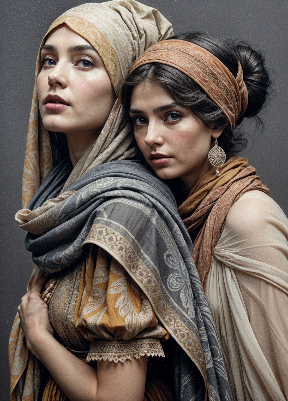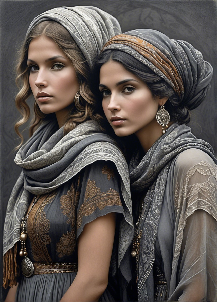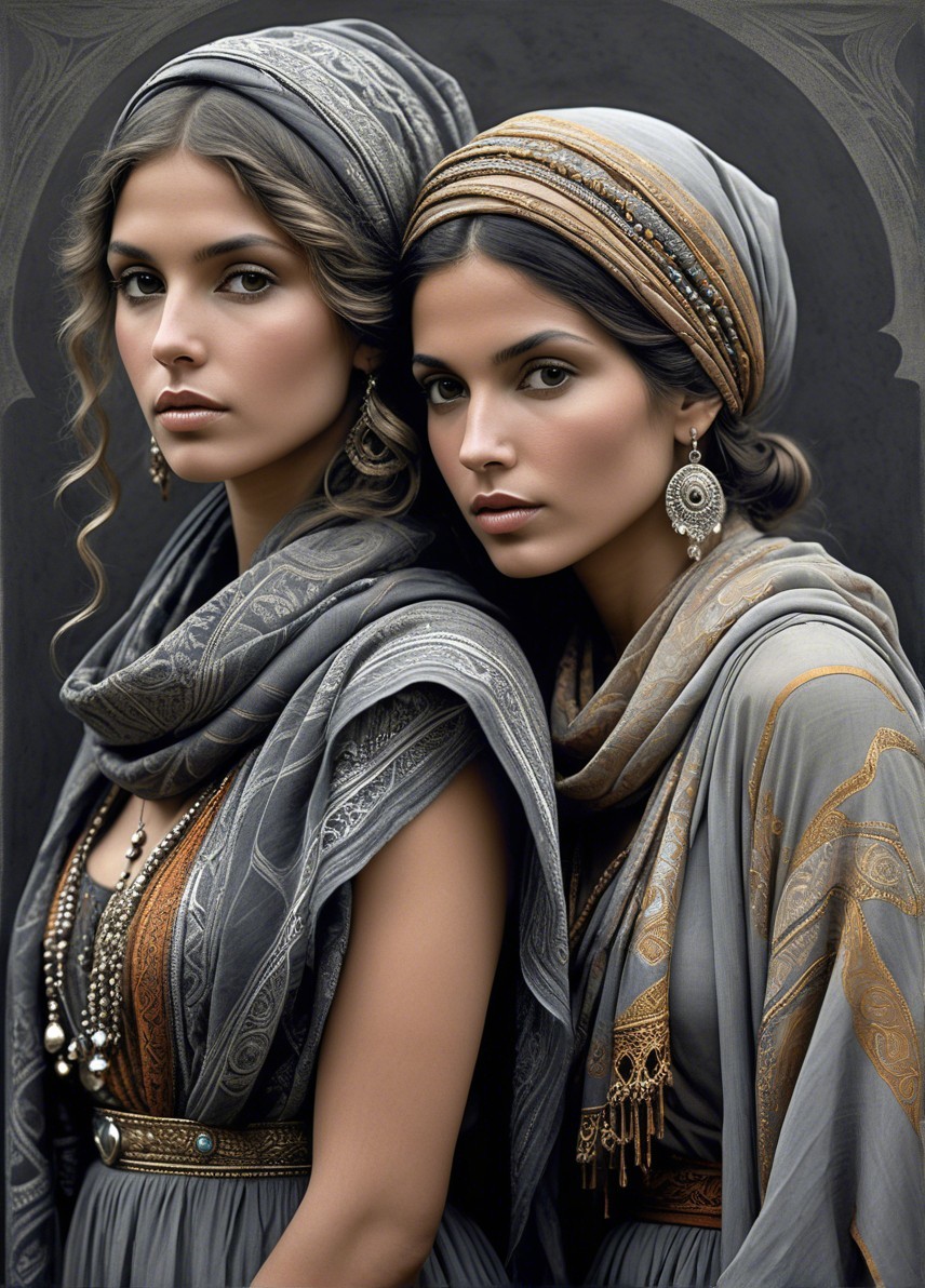 Two women with ornate headscarves and ethnic jewelry pose solemnly against a dark background, exuding an air of mystique and elegance.