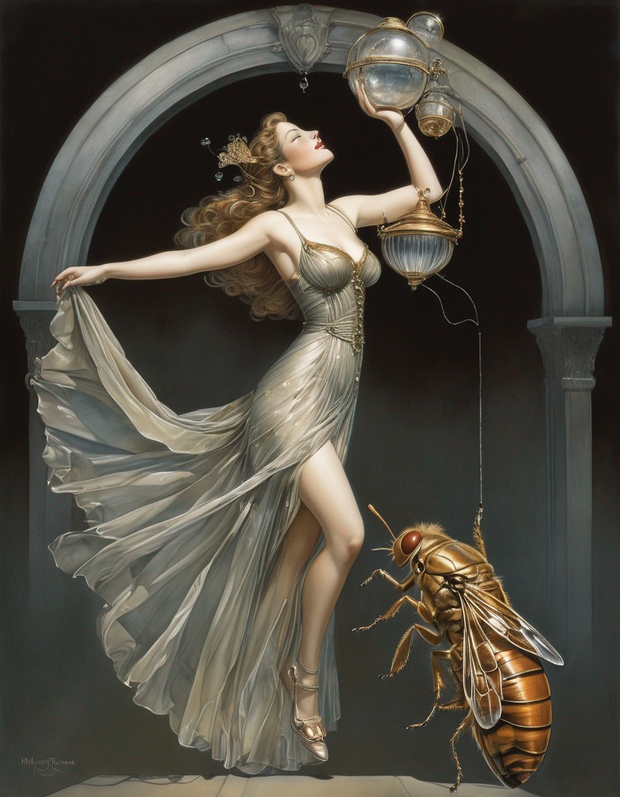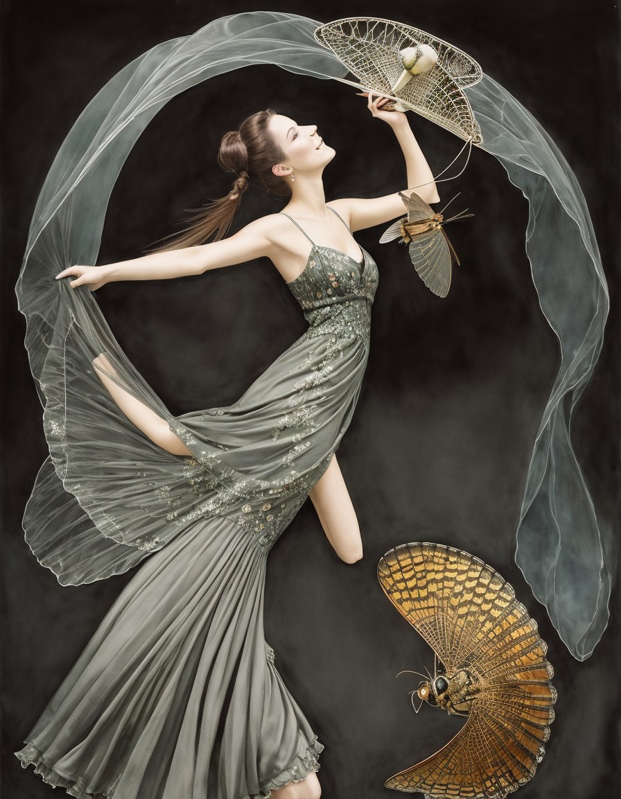 An elegant, portrait of a woman in a wide-brimmed hat, showcasing detailed attire and adorned with intricate jewelry against a dark background.