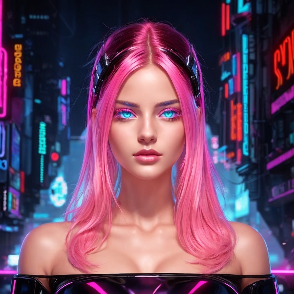 A woman with bright pink hair and striking blue eyes is depicted against a neon-lit cityscape, exuding a futuristic vibe. She is haloed by a triangle of bluish light as it cascades around her.
