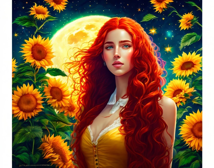 Colorful artwork of a woman with red hair, yellow dress, sunflowers, moon, and stars