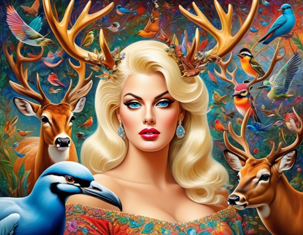 Prompt: Anna Nicole Smith big eyes with antlers and birds & animals in harmony deep dreamscape, Salvador Dali collaboration, Picasso's integrated flowing composition, colorized immersive and balanced by many bright colorful details, Disney