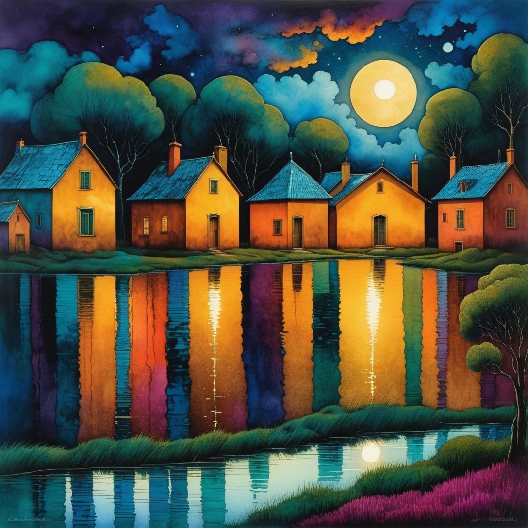 A vibrant night scene features colorful houses by a shimmering lake. The moon casts a golden glow, reflecting the vivid hues of the buildings and trees, creating a magical atmosphere.