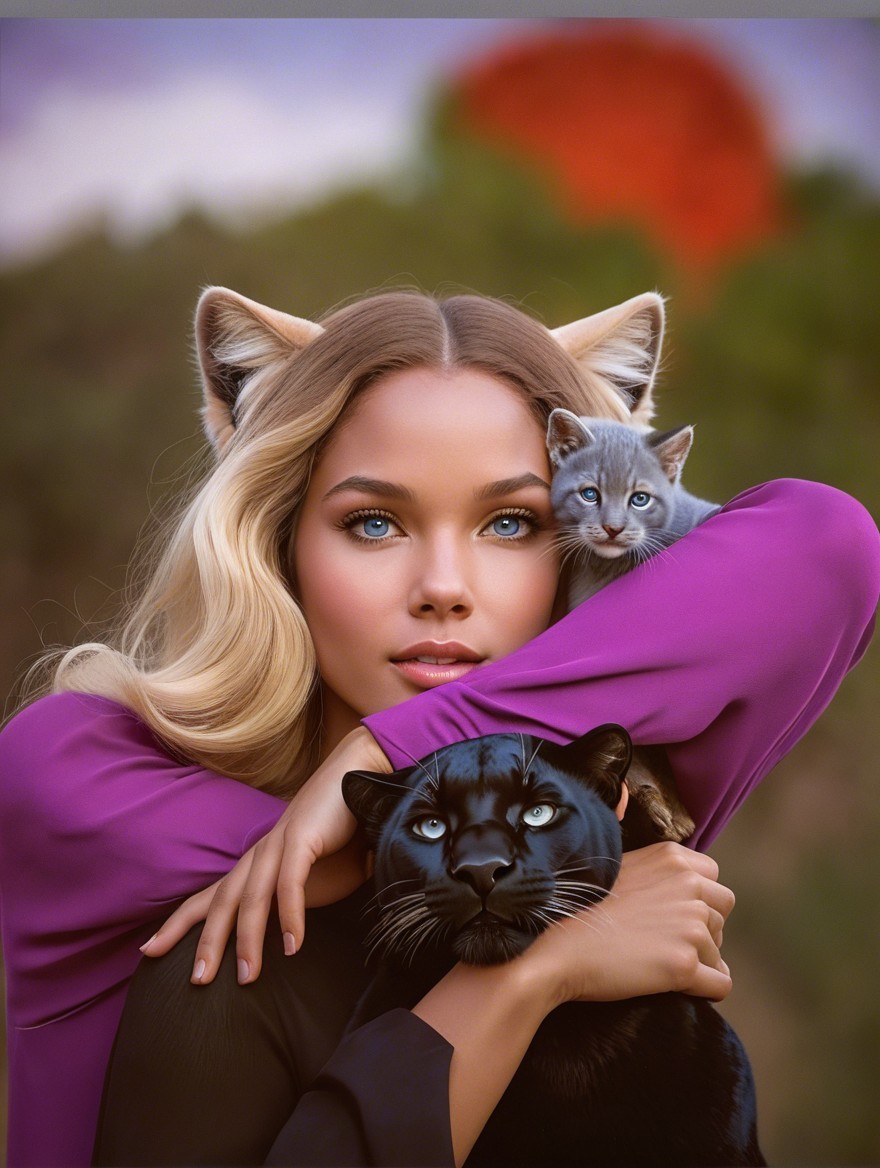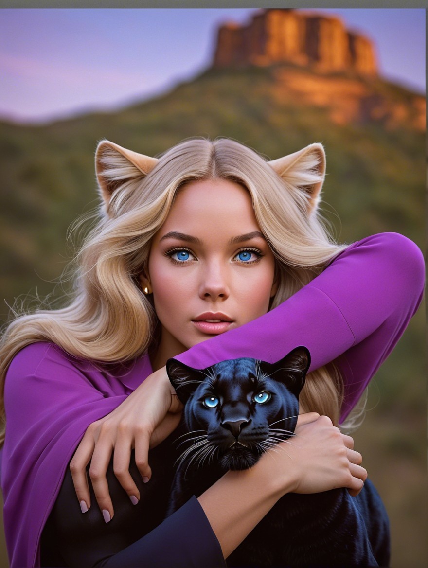 The image features two women with long blonde hair and striking blue eyes, embracing each other while holding a black panther. The background showcases a mountainous landscape, adding depth.