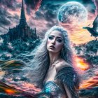 A mystical landscape features a luminous castle amid vibrant trees and ethereal skies. A striking woman with flowing silver hair gazes intently, embodying an enchanting, otherworldly presence.
