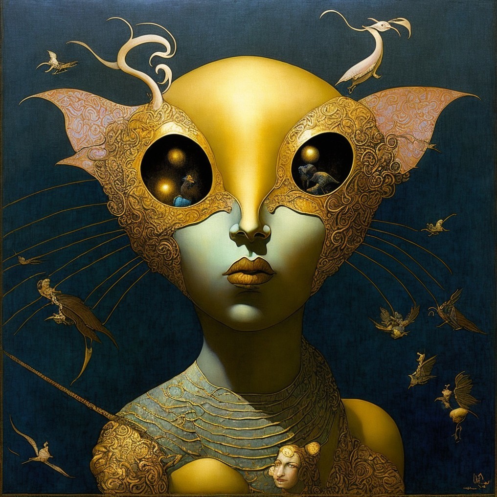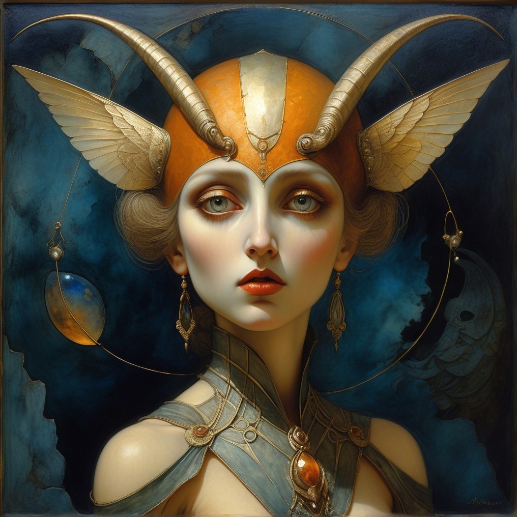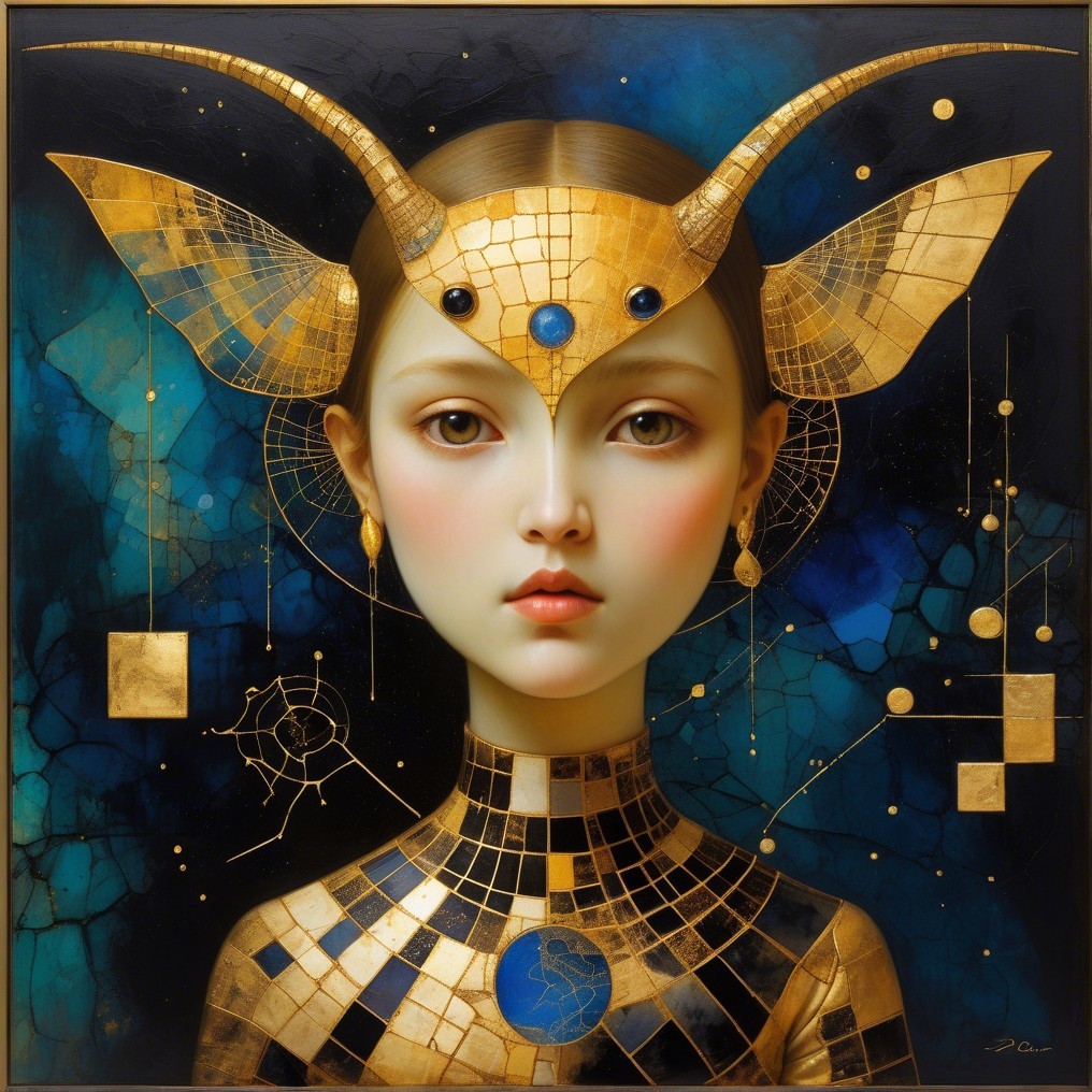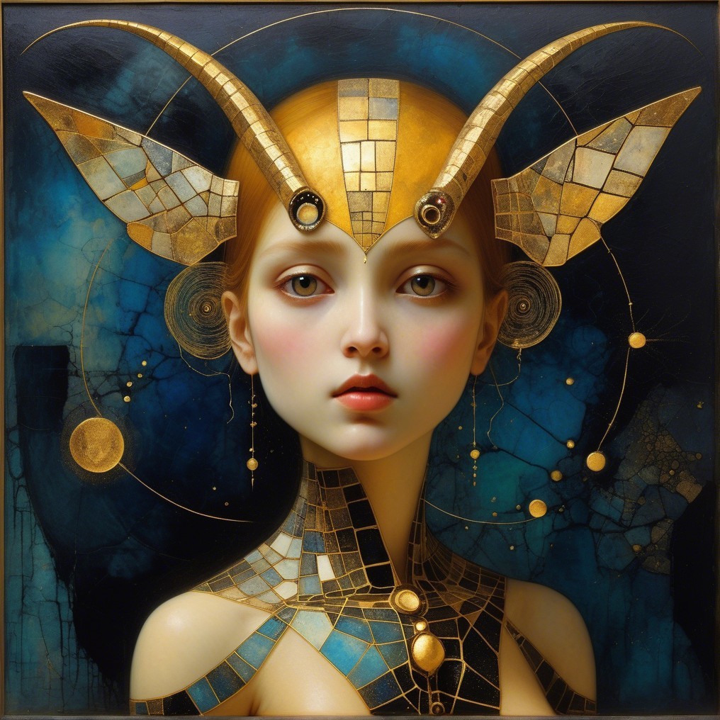The image features a stylized feminine figure with large, horn-like features, adorned in a mosaic of gold and blue hues. The background is abstract, emphasizing cosmic and geometric elements.
