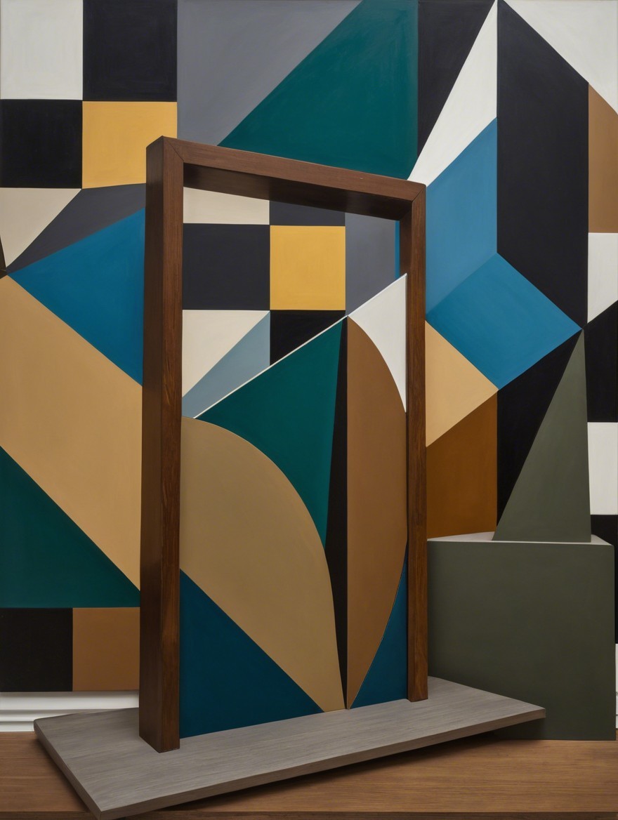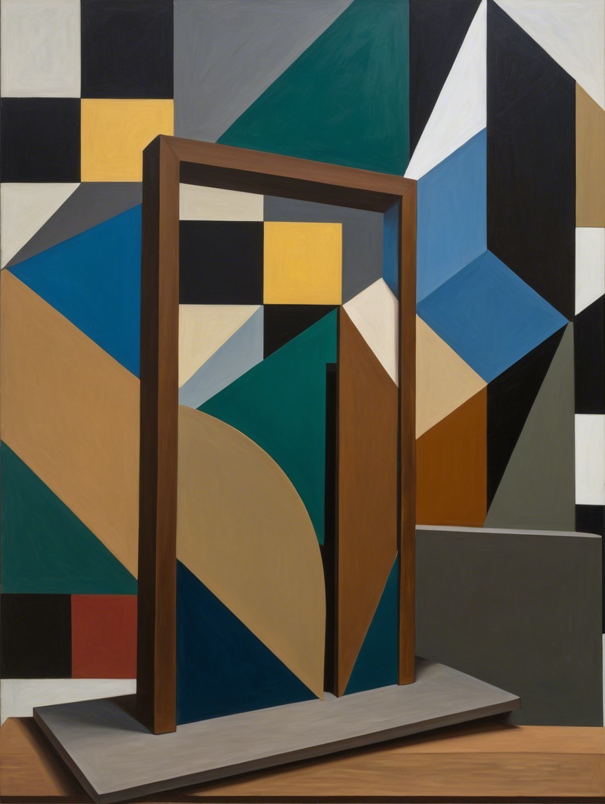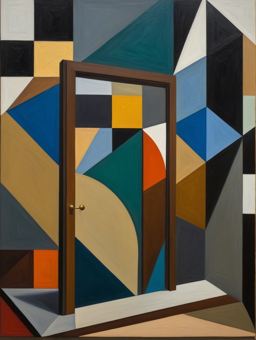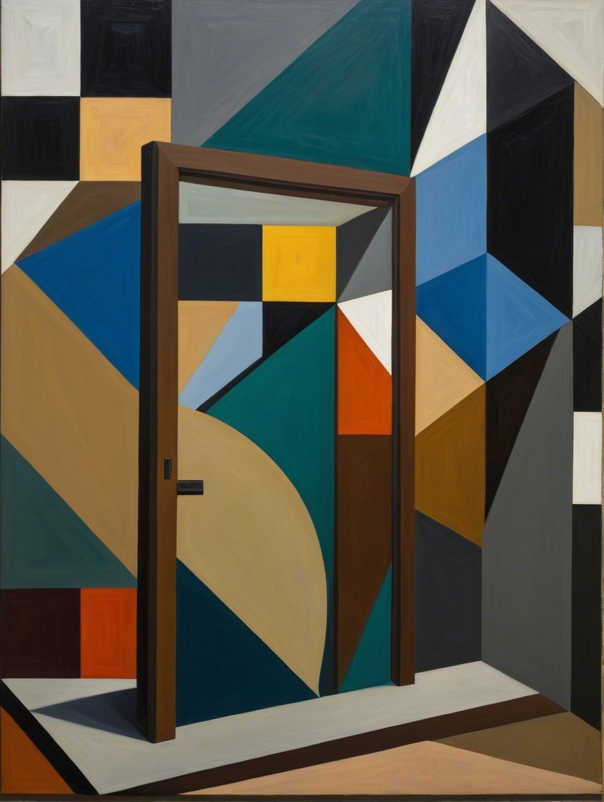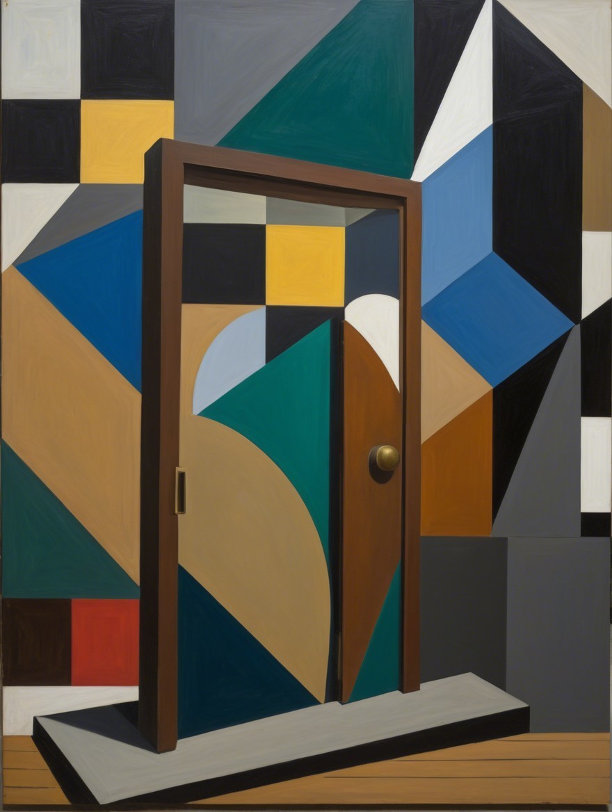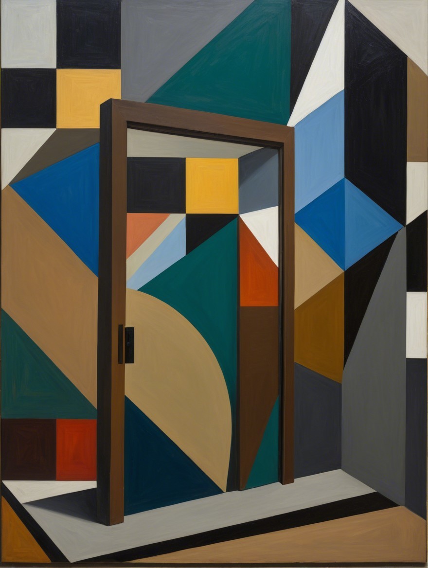 The image features a colorful abstract painting of a door set within a geometric backdrop of bold shapes and vibrant colors, creating a sense of depth and intrigue.
