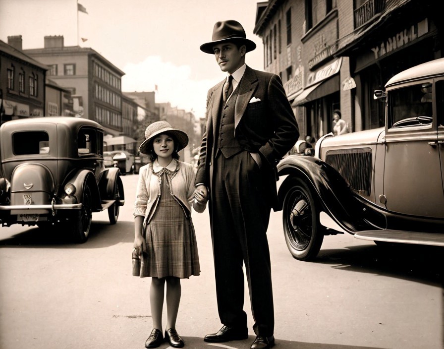 A vintage photo of a man in a suit with two children in classic attire, standing on a street with old cars in the background.