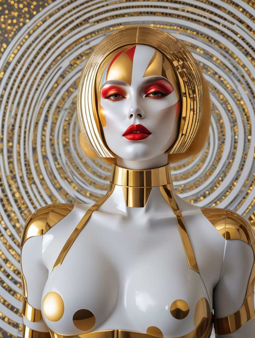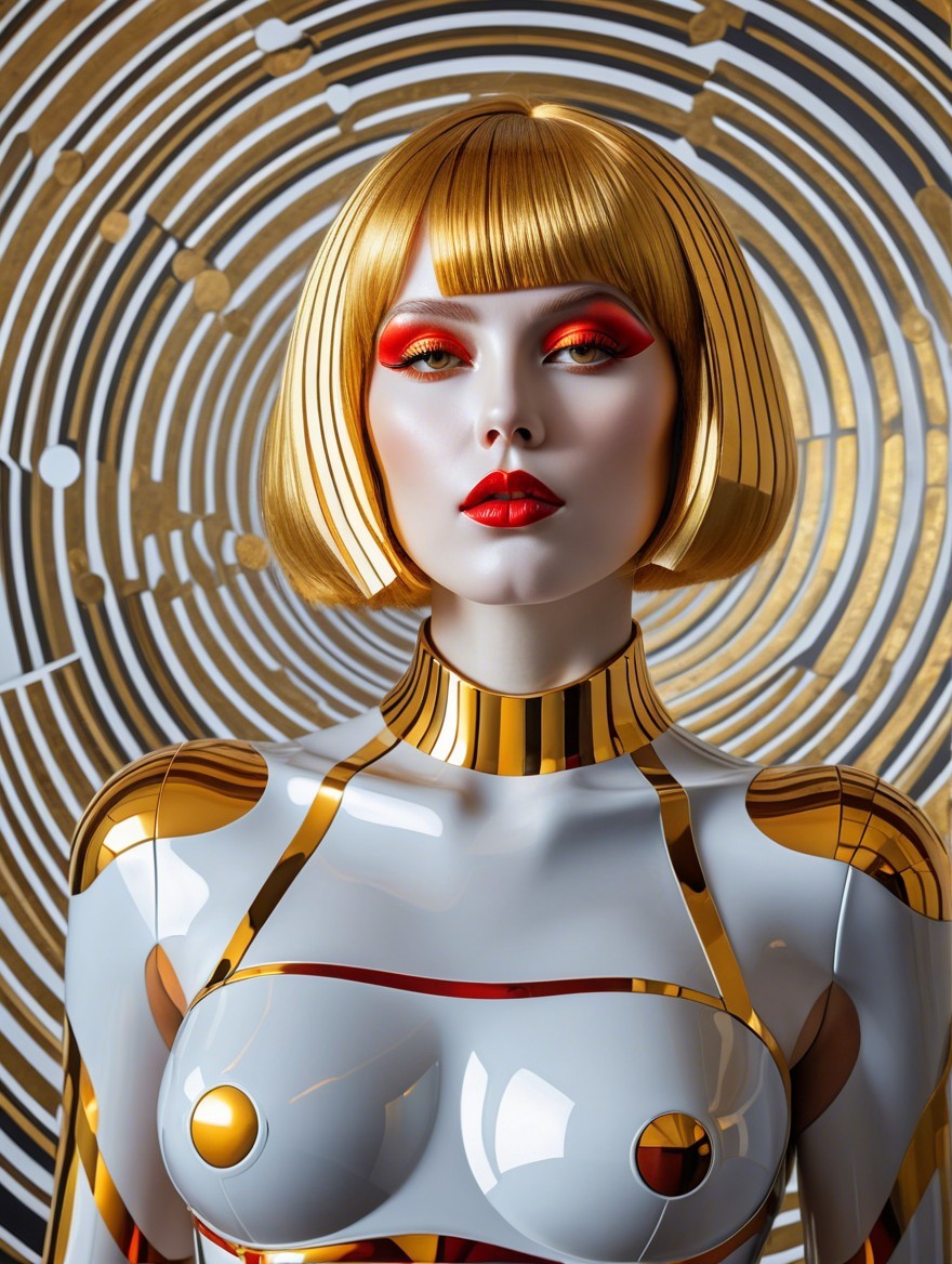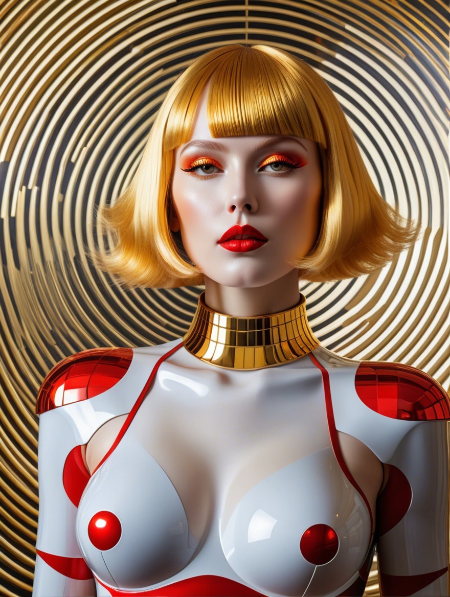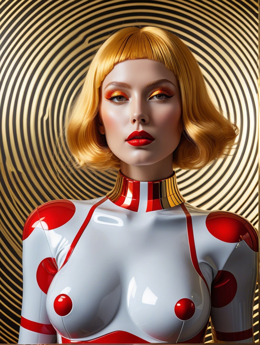 The image features a model with a striking bob hairstyle and bold red lips, wearing a glossy, polka-dotted bodysuit against a hypnotic spiral background, creating a captivating visual effect.