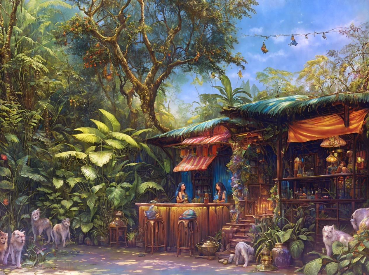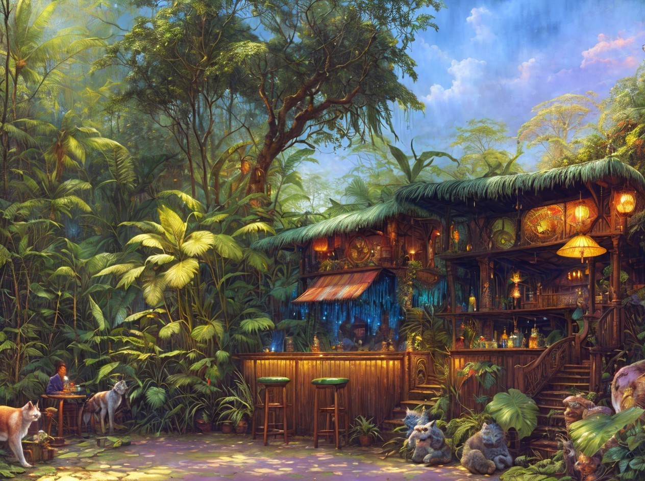 A vibrant jungle scene with an inviting treetop bar surrounded by lush greenery, people enjoying drinks, and a jaguar resting below.