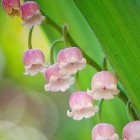 A vibrant illustration of blooming lilies of the valley, showcasing delicate pink and white flowers amid lush green leaves, set against a soft pastel background.