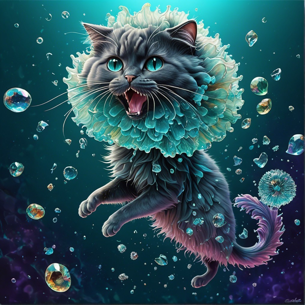 total chaos, jellycatfish, jellyfish::cat, mix from a jellyfish and a cat creature, smooth, sharp focus, deep color, exploding glass art, broken glass technique, exploding glass, glass explosion effect, 3d, glossy turquoise paisley pattern background, fluffy, 3/4 shot, no frame, a professional movie photograph of, symbols poster, drawing, watercolor, art nouveau, 1910 poster, art, futurism, jugendstil, metropolis, art nouveau, intricate, center image, golden ratio, perfect body parts, best quality, high quality, highres, detail enhancement, 8k, hdr, sharp focus, ultra detailed, perfect lighting, no disformation, fit image, no frame, symbols, sharp focus photo, uhd, hdr, professionally color graded, perfectly shaded, analog photo, high quality, highres, detail enhancement, 8k, high resolution scan, (photo by nikon d300, 30mm zeiss lens), spotlight