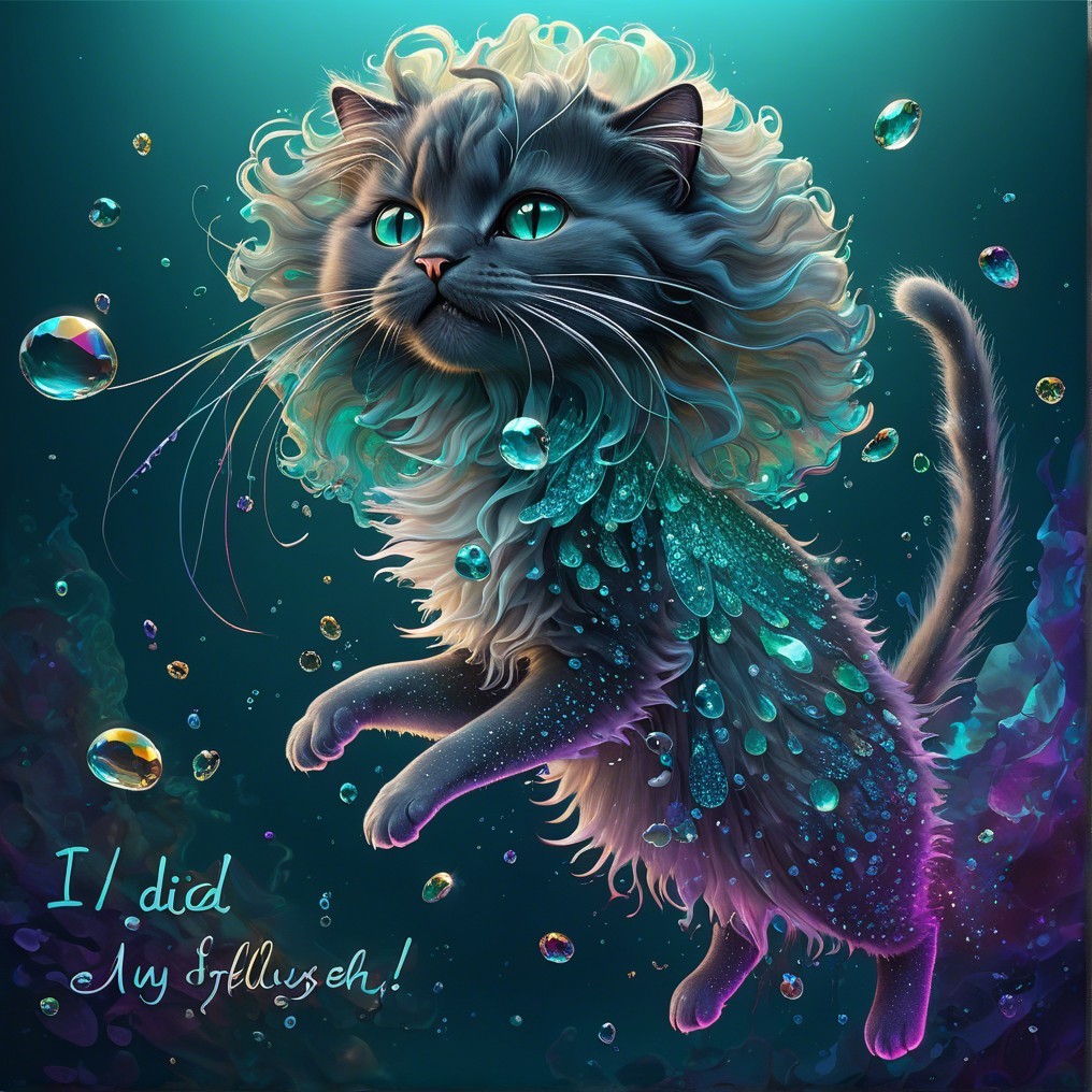 total chaos, jellycatfish, jellyfish::cat, mix from a jellyfish and a cat creature, smooth, sharp focus, deep color, exploding glass art, broken glass technique, exploding glass, glass explosion effect, 3d, glossy turquoise paisley pattern background, fluffy hair, text "i did it my way" in modern handwriting in background, 3/4 shot, no frame, a professional movie photograph of, symbols poster, drawing, watercolor, art nouveau, 1910 poster, art, futurism, jugendstil, metropolis, art nouveau, intricate, center image, golden ratio, perfect body parts, best quality, high quality, highres, detail enhancement, 8k, hdr, sharp focus, ultra detailed, perfect lighting, no disformation, fit image, no frame, symbols, sharp focus photo, uhd, hdr, professionally color graded, perfectly shaded, analog photo, high quality, highres, detail enhancement, 8k, high resolution scan, (photo by nikon d300, 30mm zeiss lens), spotlight