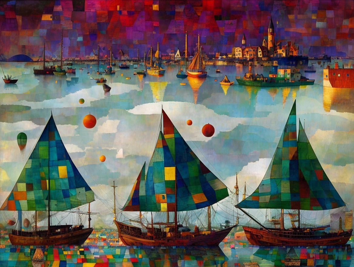 Vibrant sailboat mosaic painting on serene waters with city skyline and sunset