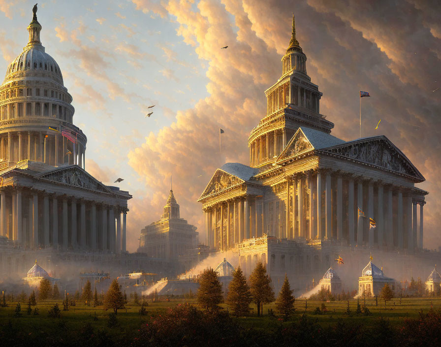 An illustrious image of the Capitol Building bathed in golden sunlight with dramatic clouds overhead and hints of fog at its base.