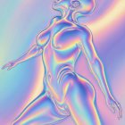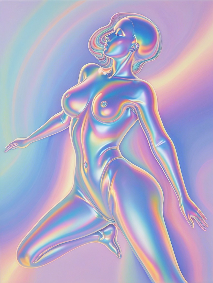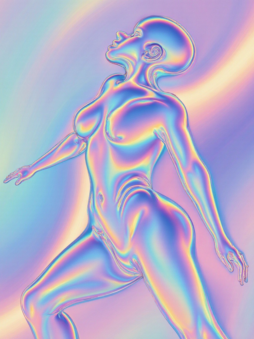 A stylized, iridescent figure of a woman kneels gracefully, exuding a sense of calm. The background features soft, swirling pastel colors that enhance the ethereal quality of the image.