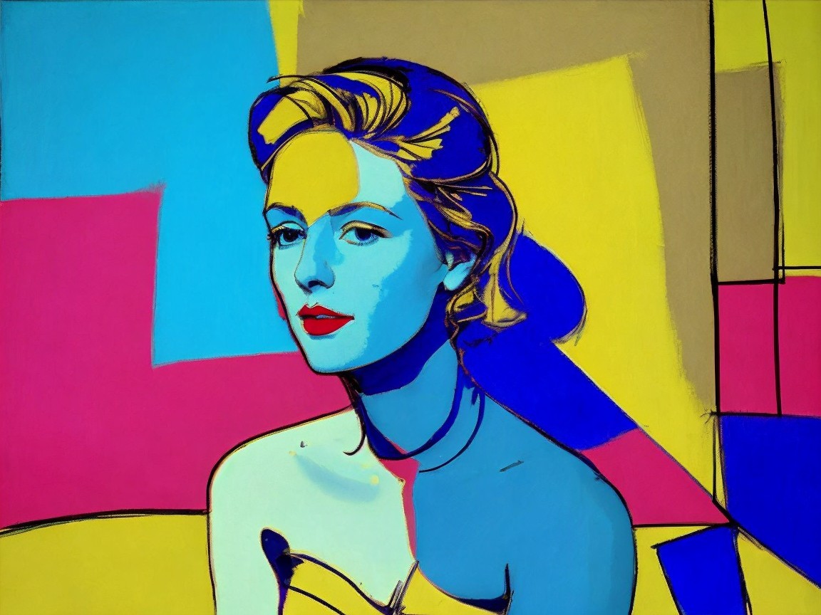 A portrait of a blonde actress on stage in colored lights, against a backdrop of bold, colorful geometric graffiti shapes.