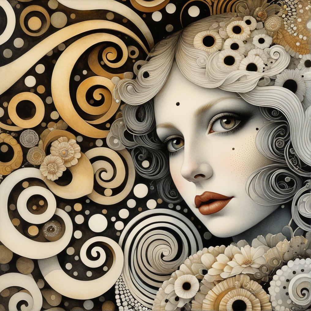 The artwork features a stylized portrait of a woman with flowing hair and a large hat. Intricate swirls and patterns surround her, blending soft tones and bold contrasts, creating a captivating visual.
