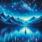 A vibrant, stylized landscape featuring colorful trees and a serene lake. A small sailboat glides through the water, surrounded by misty hills and a patchwork sky filled with stars.