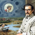 A tranquil coastal scene features a man with glasses and a mustache, gazing thoughtfully. A ship sails under a large moon, with a mix of quaint buildings and a distant castle on the shore.