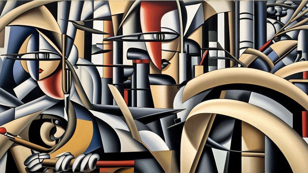 The image features a stylized profile of a woman with bold geometric shapes. She has vibrant blue hair, striking red and black facial accents, and bright red lips, set against a black background.