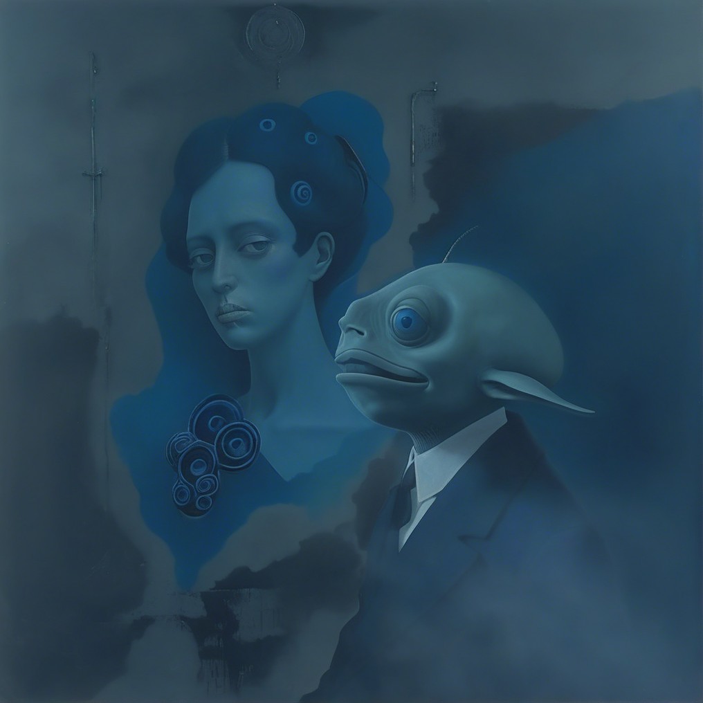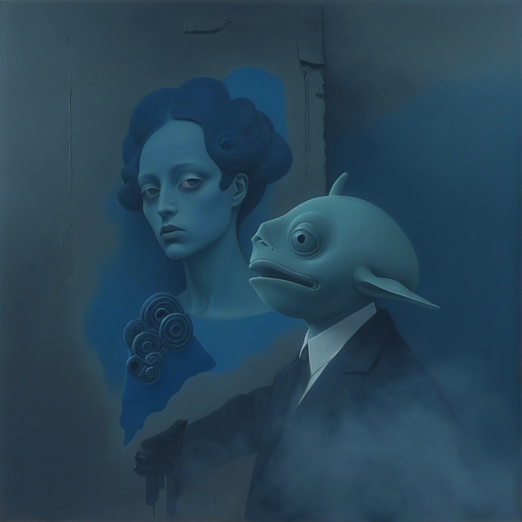 Artistic Statement: This piece embodies surrealism infused with a neo-noir sensibility, where the AnthropoFish performs a solemn, ambiguous gesture towards a human figure confined within art. The monochromatic blue palette enhances the dreamlike and introspective mood, while the spirals act as cryptic symbols—perhaps representing memory, devotion, or the passage of time. The composition follows Magritte’s paradoxes, de Chirico’s metaphysical depth, and Beksiński’s haunting stillness, creating a striking moment of frozen narrative.