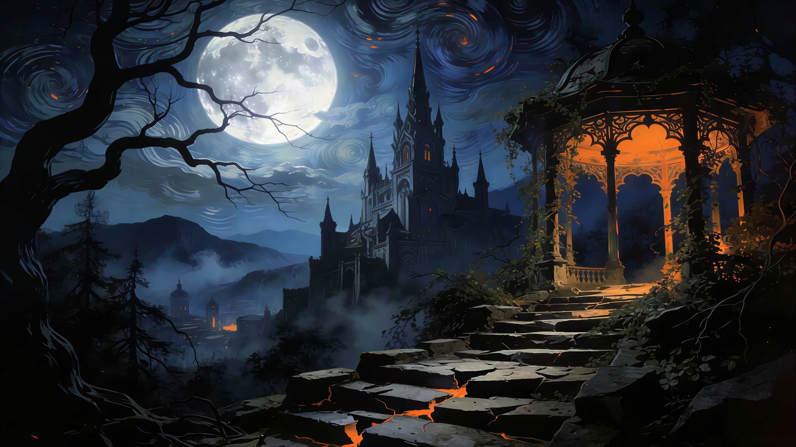 A moonlit night fantasy landscape features a dramatic contrast between the cool blues of the night and the warm oranges of illuminated elements. A colossal, bright full moon dominates the upper left sky, partially obscured by thin, swirling clouds. In the foreground, a gnarled, dark tree with bare branches stretches