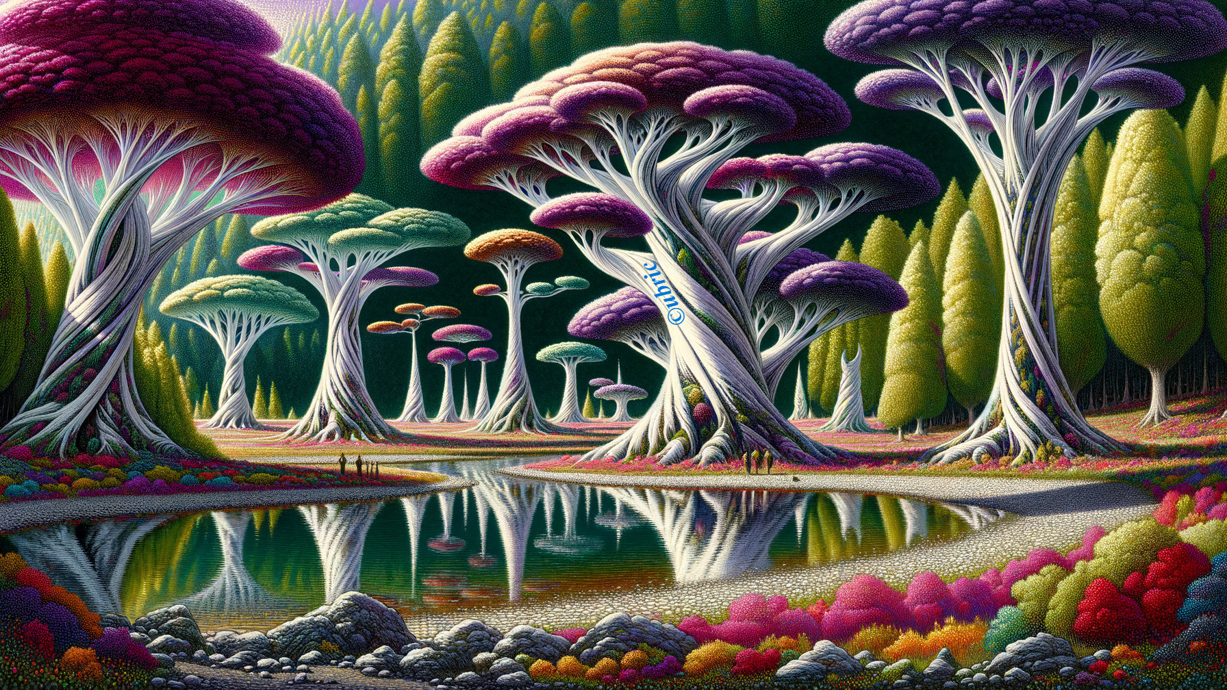 A vibrant landscape features whimsical, colorful trees with oversized canopies, reflected in a tranquil lake. Lush greenery and striking floral accents create a fantastical atmosphere.