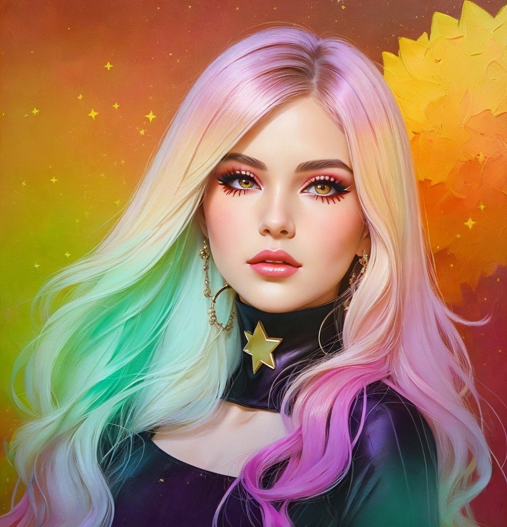 Prompt: serene textured oil paint brushstrokes: a stylized melancholic hard rock girl with a long, curved colorful hairdo adorned with black textured stars and a peach colored background. 1970s animated female comic book character, she has a pale face with devilish eyes, rosy cheeks, and delicate makeup. Complexion 1.2, mystical, forbidden, trepidation-inducing, alienated, otherworldly, anisotropic filtering 1.7, silk blouse features a brass ruffled collar, intricate red and pink patterns on the sleeves, and a textured bodice. The background is a orange with pink clouds impasto. Gouache textures, The overall image has a dreamy, vintage aesthetic by Georgia o'keffee and Arlie Opal, 3d effects 1.8, blurry aura, cottagegore 1.2, beautiful, clear, nice, raytraced shadows 1.8, divisionism, quilling, quaint, cel-shaded, somber, pastel colors of beige and red, triadic color scheme beige red orange, reminiscent of Caspar David Friedrich and Overton Lloyd, plasticity 1.3, auracore 1.7, dreamscape, traumacore 1.9, concept art, stylized illustration 1.5, subtle coloring 1.9, withered pale colors,