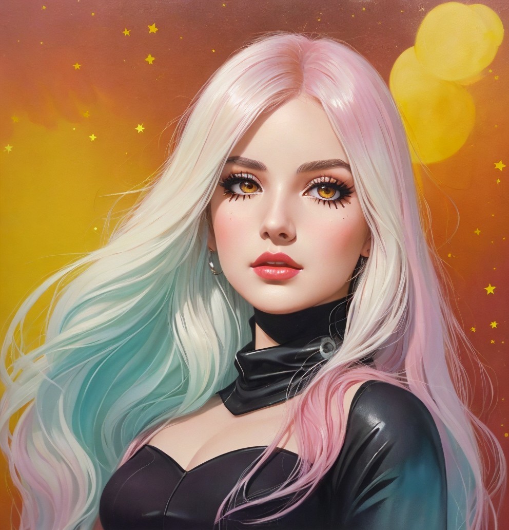 A stylized portrait of a woman with pink to teal ombre hair, large eyes, against a starry, warm backdrop.