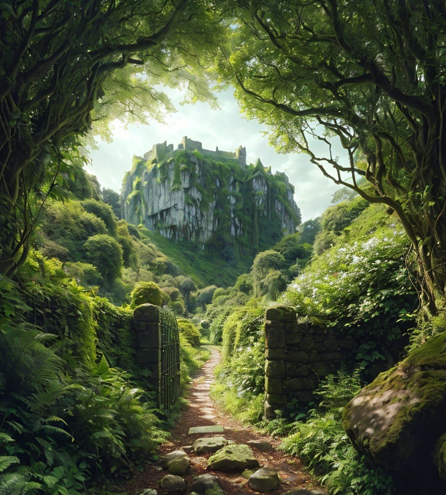 A serene path leads to a majestic castle atop a lush, green cliff, framed by an arch of intertwining trees under a bright sky.