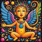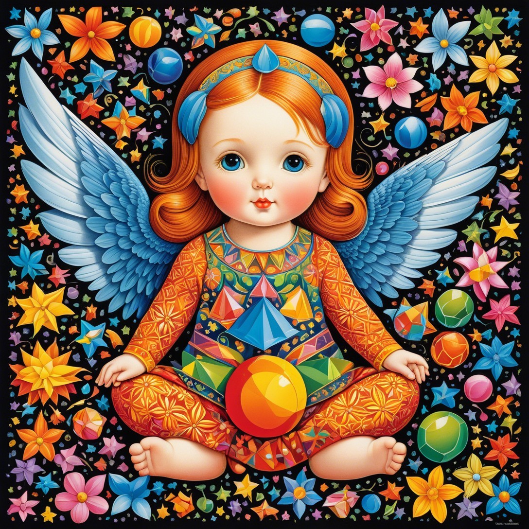 A digitally illustrated close-up of a cherubic baby angel sitting cross-legged on a black background, looking directly forward. The baby has fair skin with blush on their cheeks, long red hair with soft curls that frame their face, and plump, peach lips. Both of the angel’s large