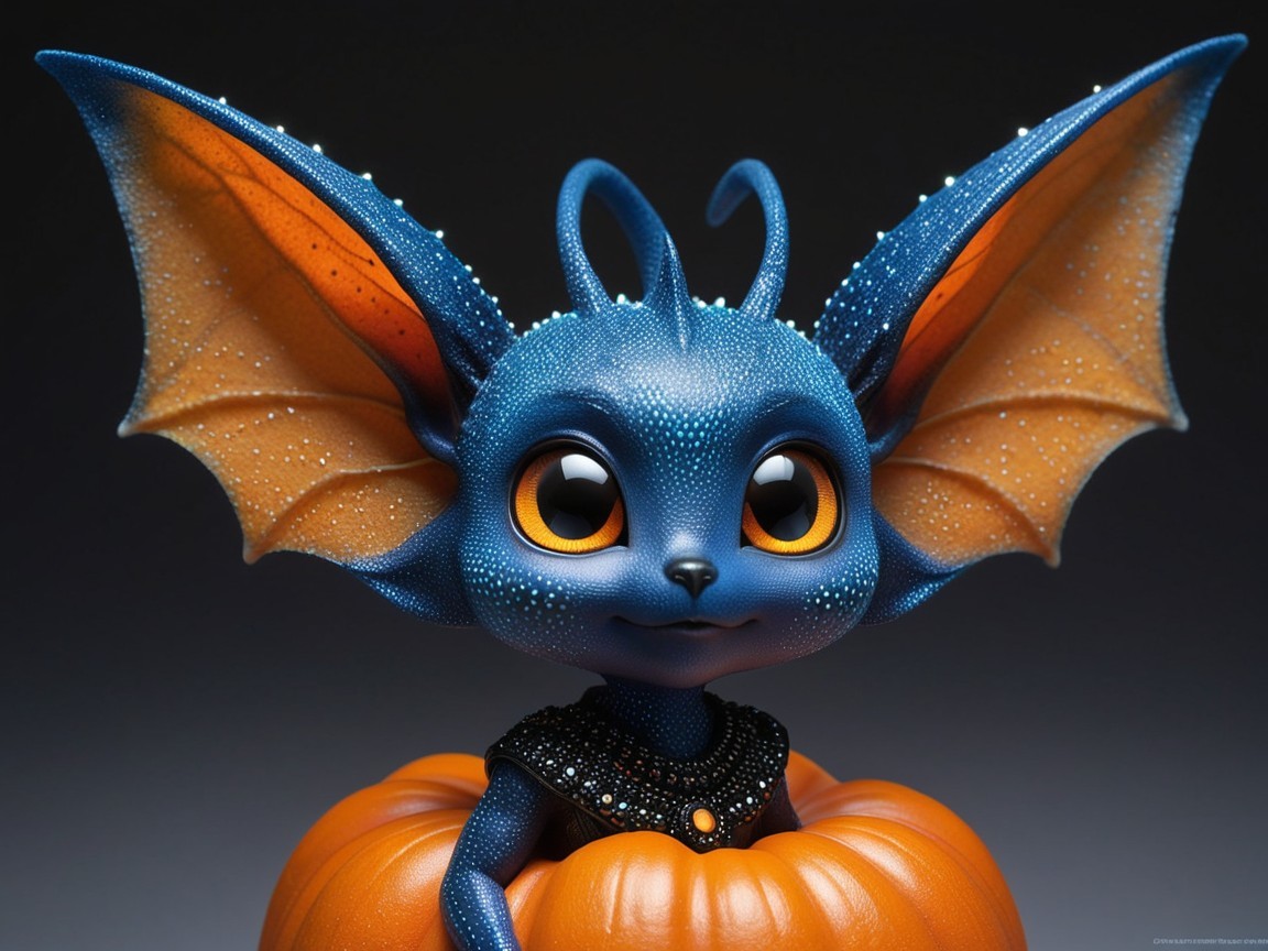 Prompt: "(((Masterpiece))) octane renders shibori and synthetic silk: A gorgeous alien, female has a bob like a bioluminescent pumpkin with scintillating skin painted with pointless pointillist detail, gleaming throughout it, her ears show through her hair and are cute like bat ears hearing the ultrasonic, her ears are glamorously fuzzy for her planet. She's gotten ready for the Halloween party wearing a finely woven kimono of bioluminescent pumpkin leaves and strands that echo a refinement of spider web finesse to show off her collarbone and any nanotech embedded in her skin, and it's futuristic, yet she has a futuristic pirate shirt on that is bioluminescent and as numerous floating rings of gold around her neck, some are small or some are large and interlinked and patterns like geodesic or flower of Life combos.
