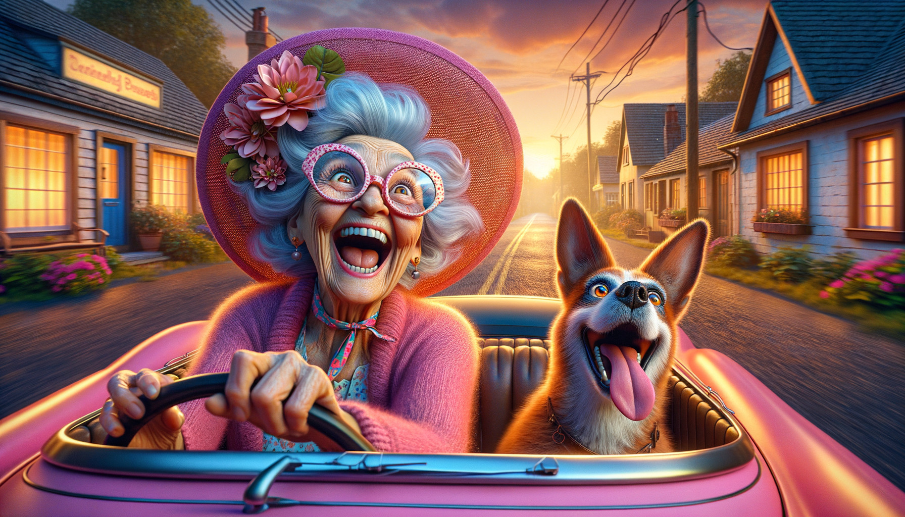 An elderly lady with glasses and a floral hat drives a pink car with a joyful corgi, wearing sunglasses, at sunset.