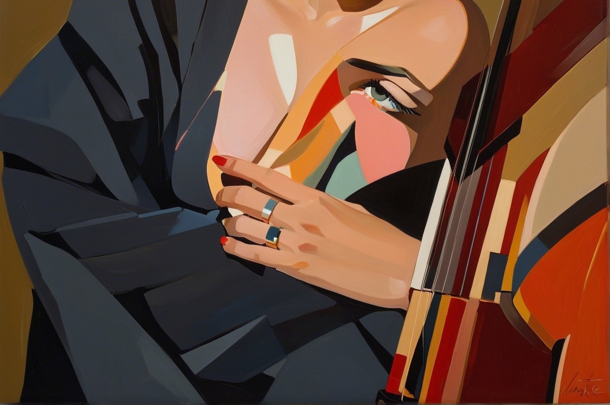 The image features a close-up, stylized portrait of a man with a light beard and gray hair, resting his chin on his hand, set against a vibrant, colorful background. He’s holding a cello.